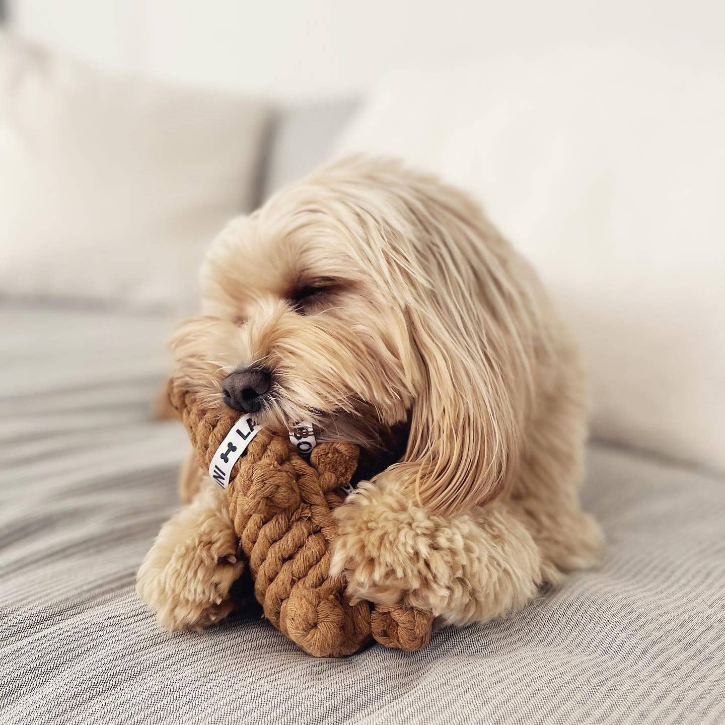 Dieses Plüschtier ist bei uns der absolute Hit. Schon beim Auspacken wurde es neugierig beschnuppert – und seitdem wird gekaut, gequietscht und herumgetragen, was das Zeug hält.