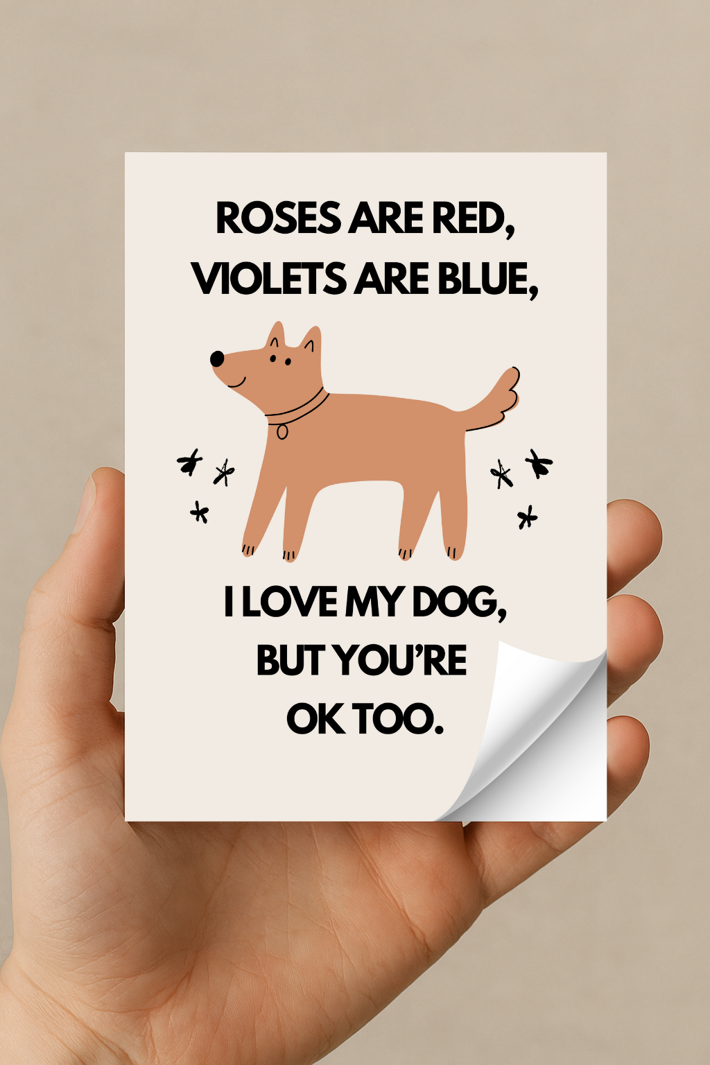 "Roses are red, Violets are blue, I love my dog, but you're ok too" - Ideal für Hundefreunde und Menschen mit einem Sinn für Humor.