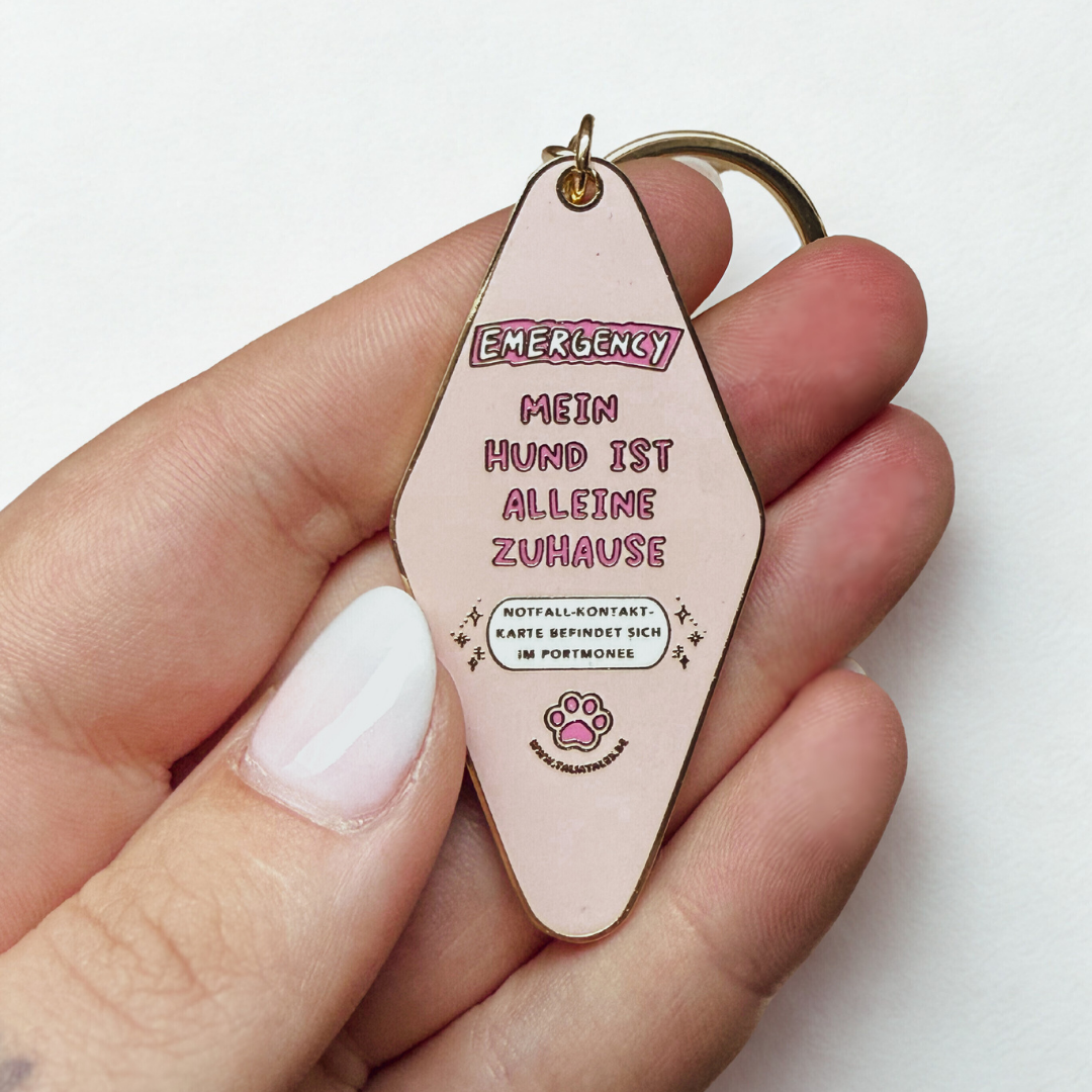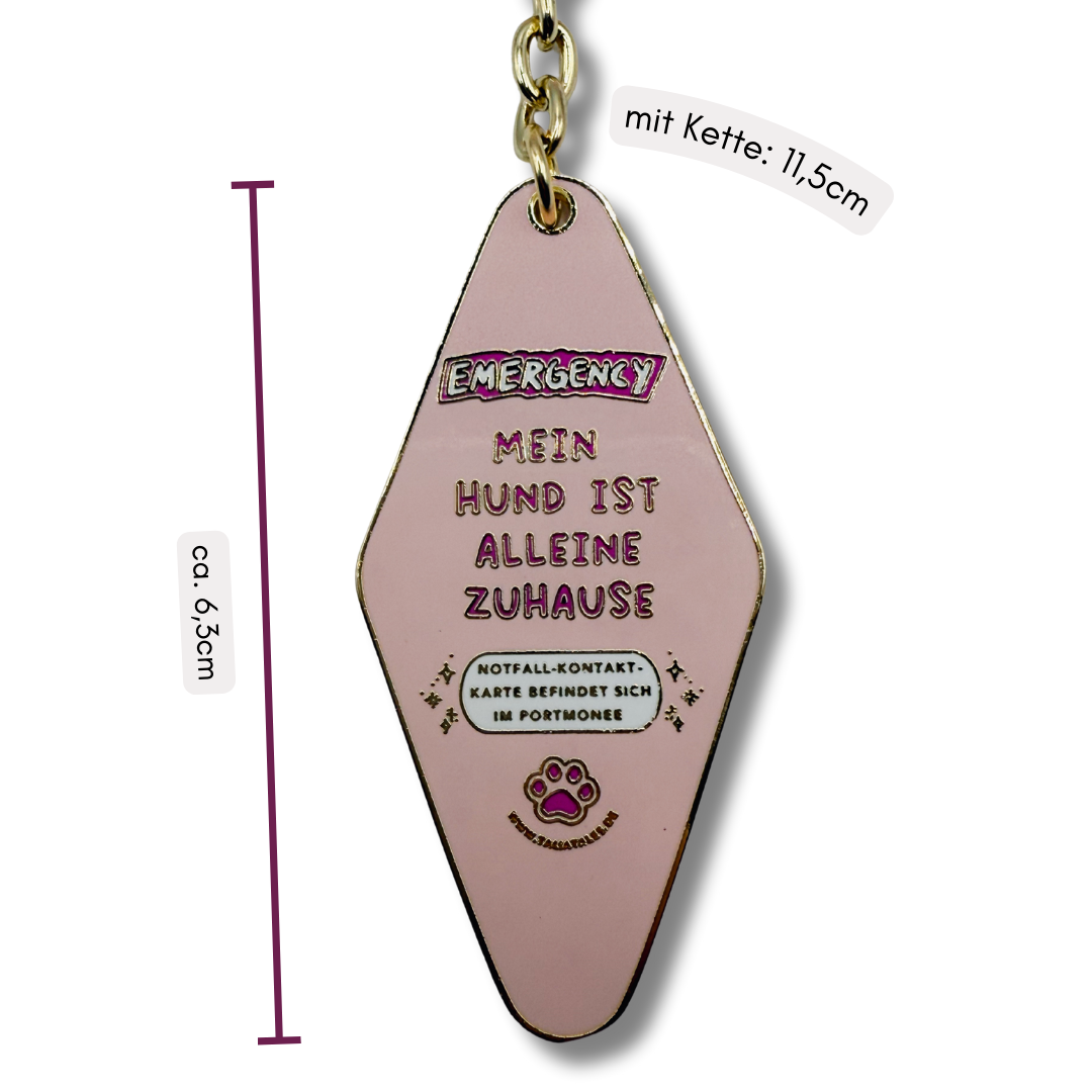 Unser Metall-Schlüsselanhänger „Mein Hund ist alleine zuhause“ ist nicht nur ein dekoratives Accessoire, sondern ein wichtiger Hinweis für den Ernstfall.