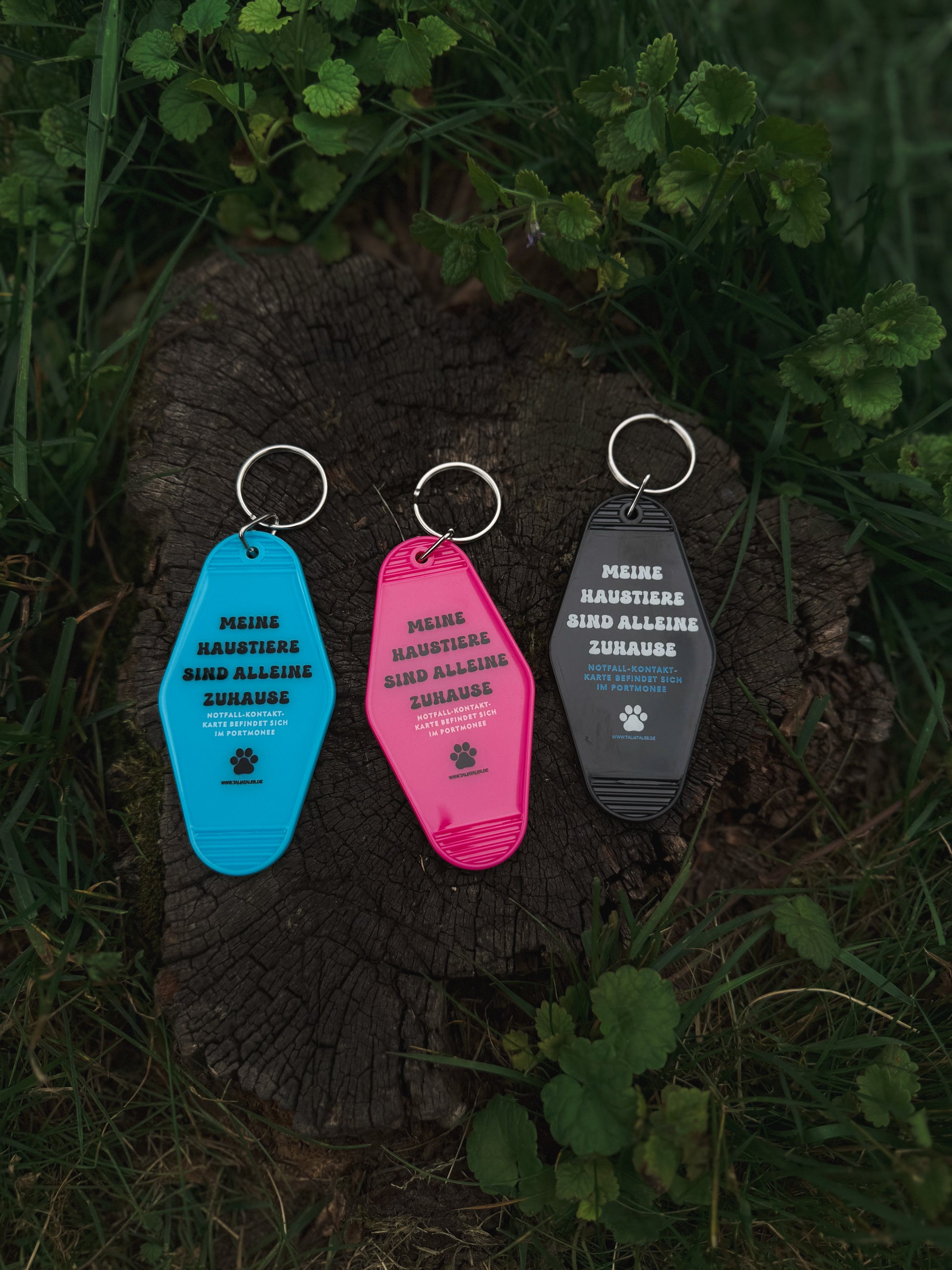 Schlüsselanhänger „Meine Haustiere sind alleine zuhause“ Pink – inkl. Notfallkarte