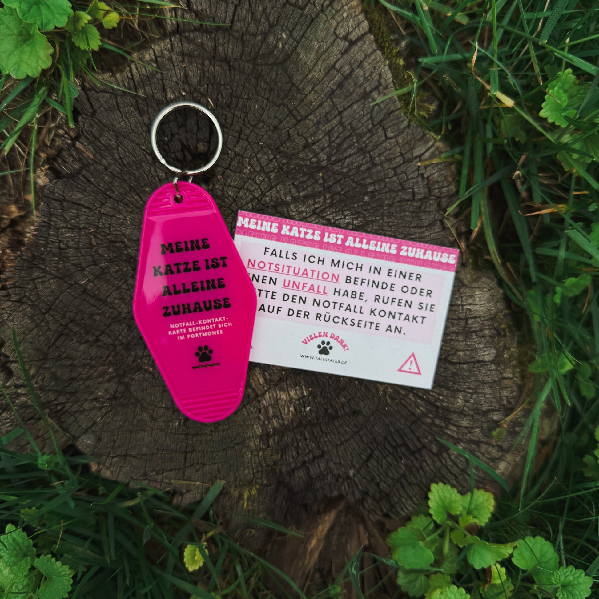 Schlüsselanhänger „Meine Katze ist alleine zuhause“ Pink – inkl. Notfallkarte