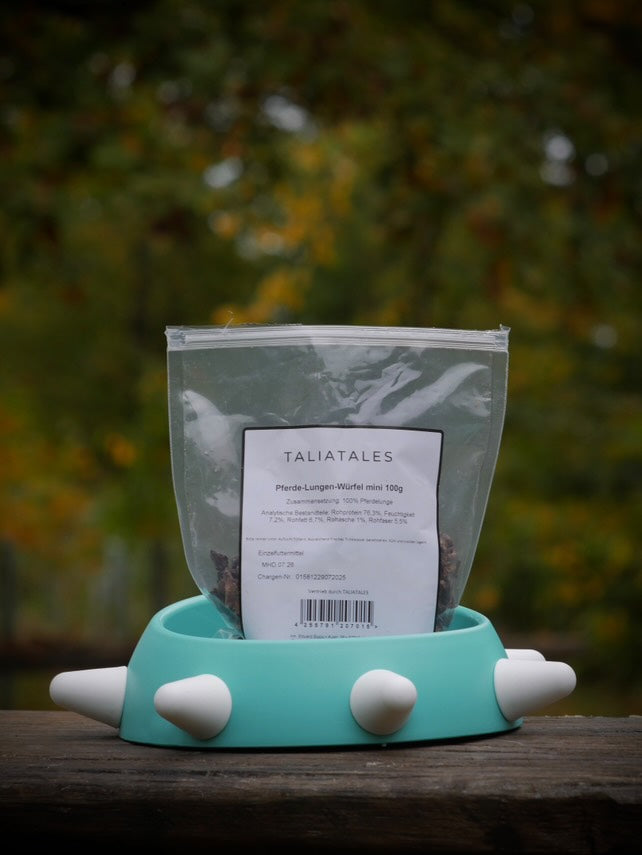 Dieser Napf vereint funktionales Design mit einem stylischen Look in Aquamarin mit weißen Nieten. Die leicht schräge Form unterstützt ein angenehmes Fressen – vor allem für brachyzephale Hunde wie Mops, Bully & Co. Aber auch andere Rassen profitieren: ergonomisch, rutschfest und im Alltag einfach praktisch.