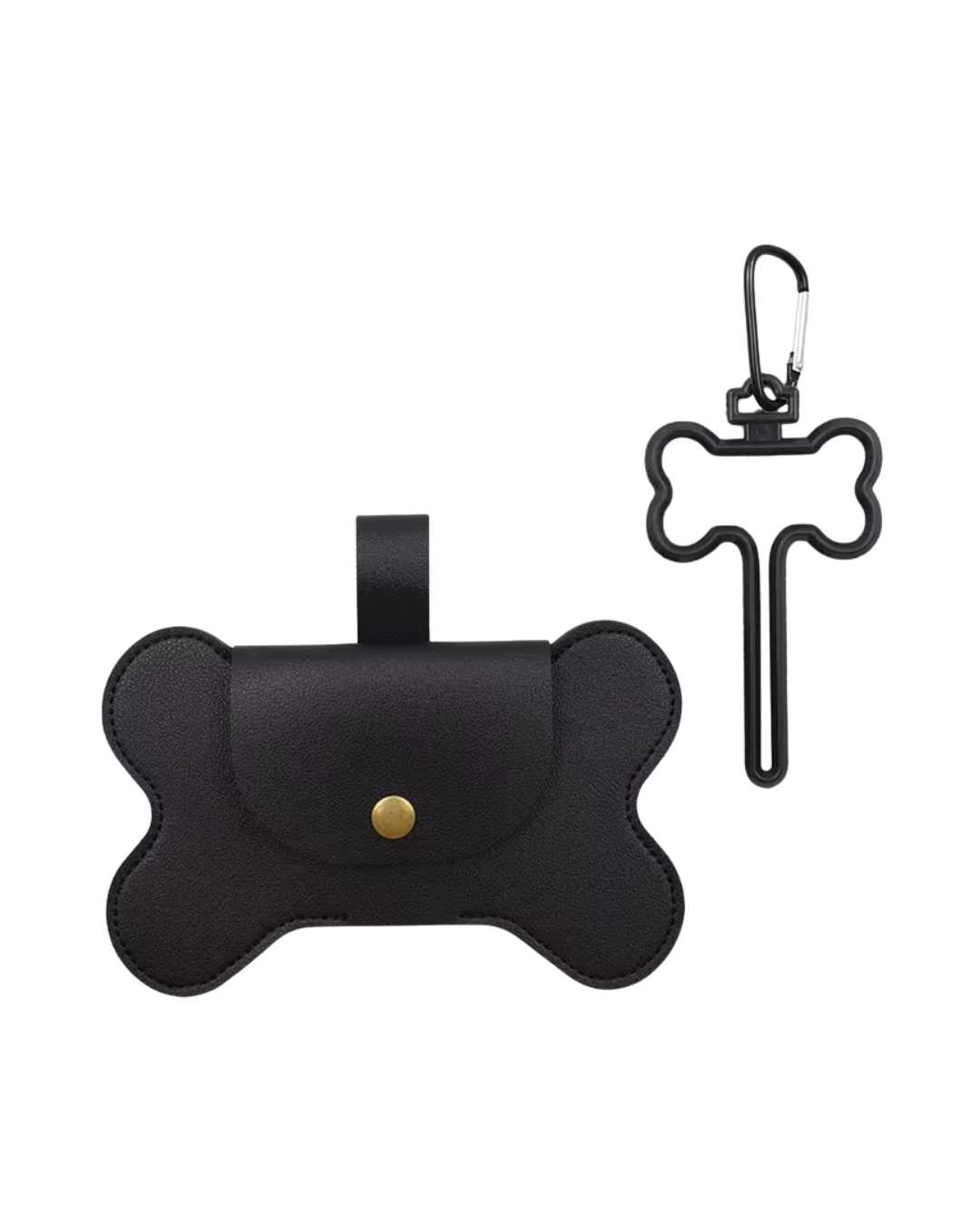 Das zweiteilige Set kombiniert einen großzügig geschnittenen Kotbeutelspender aus Kunstleder mit einem stabilen Metallhalter für volle Beutel. Beide Teile sind aufeinander abgestimmt und bieten eine praktische Lösung für unterwegs.